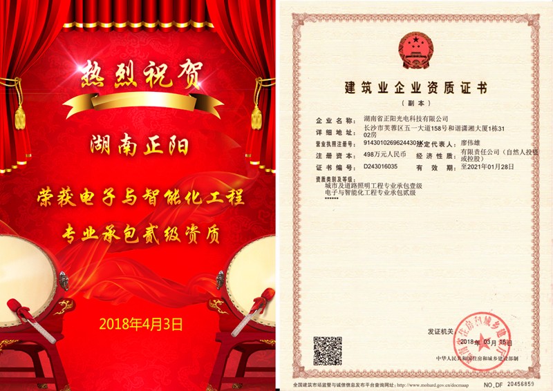 2018年4月3日,經(jīng)湖南省住房和城鄉(xiāng)建設(shè)廳批準(zhǔn),湖南正陽(yáng)獲得“電子與智能化工程專業(yè)承包貳級(jí)資質(zhì)”證書(shū)。