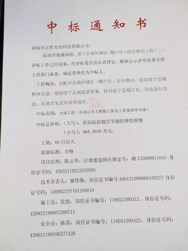熱烈祝賀湖南正陽成功簽約綏寧縣城舊城區(qū)(棚戶區(qū))綜合整治工程亮化工程(二)施工項目!  查看詳情