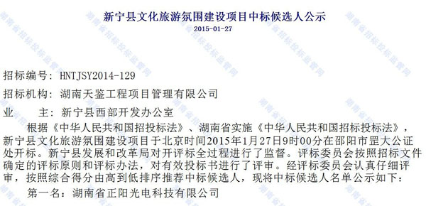 2015年1月27日,我公司成功中標(biāo)新寧縣文化旅游氛圍建設(shè)項(xiàng)目,熱烈祝賀祝湖南正陽(yáng)成功中標(biāo)新寧縣文化旅游氛圍建設(shè)項(xiàng)目!  查看詳情